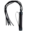 Chicote com base em madeira revestida de couro sintético liso. Possui tiras do mesmo material.